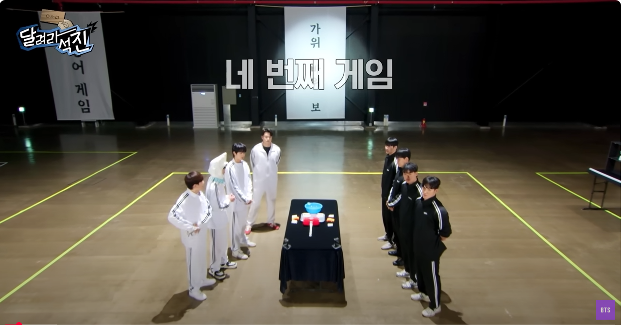 [달려라 석진] EP.25 오Jin어 게임 2 [달려라 석진] EP.25 오Jin어 게임 21. 가위 바위 보- 각 팀원 2명은 서로 한손을 묶는다.- 남은 손 하나만 사용하여 가위바위보 하나 빼기 게임.- 이기면 쟁반으로 때리고, 지면 바가지로 막는다.- 가위바위보에서 이길 경우 점수 획득 2. 무궁화 꽃이 피었습니다.- 앞에 놓인 총 8개의 팻말에는 게임에 참여하는 보인의 이름이 쓰여있다.- '무궁화꽃이 피었습니다.' 구호에 맞춰 바닥에 있는 총을 습득.- 빨간선 밟고 있을때는 자유롭게 사격 가능.- 본인 이름이 적힌 팻말을 사격후 돌아오면 성공. 3. 미션계주- 팀별로 4인 5각 구도로 다리를 묶는다.- 팀원 한 명당 게임 하나씩 진행.- 준비된 게임을 모두 끝내고 박을 먼저 터트리는 팀이 승. - 미션 Start - 딱지치기 (동표) - 공기.. 방탄소년단(BTS)/BTS 2025.03.12