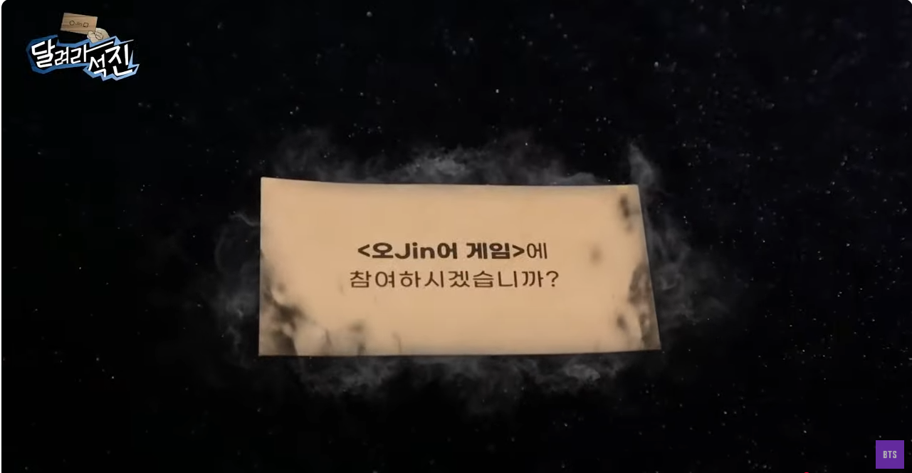[달려라 석진] EP.24 오Jin어 게임 1 [달려라 석진] EP.24 | 오Jin어 게임 11. 오진어 게임 초대장 석진의 겔럭시워치 스포이티 2. 출연진 - 신승호, 손동표, 남창희 - 포인터 게임 - 상대팀 3. 둥글게 의자 뺏기 게임 4. 전략 줄다리기 5. 오징어 게임 6. 가위 바위 보 - 다음주 2부 https://www.youtube.com/watch?v=A2oK2xPvJV0 방탄소년단(BTS)/BTS 2025.03.04