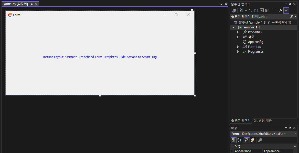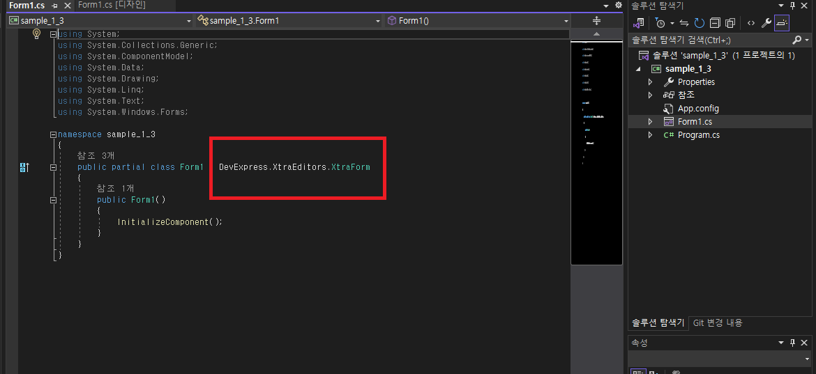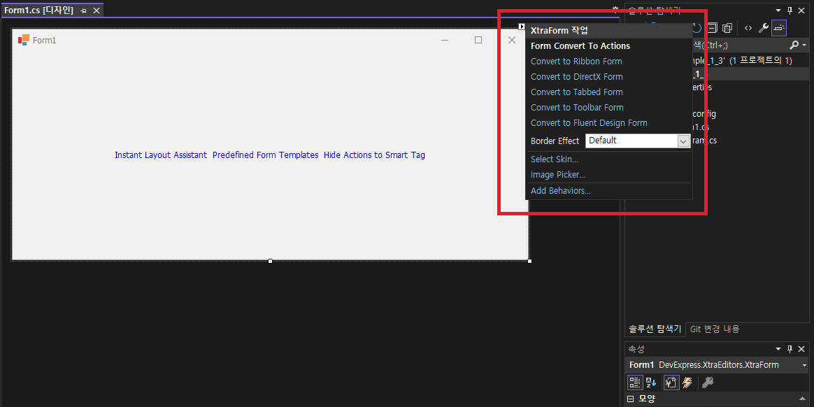 - 기본 폼이 DevExpress.XtraEditors.XtraForm 으로 되어 있는것을 확인해 볼수 있습니다.