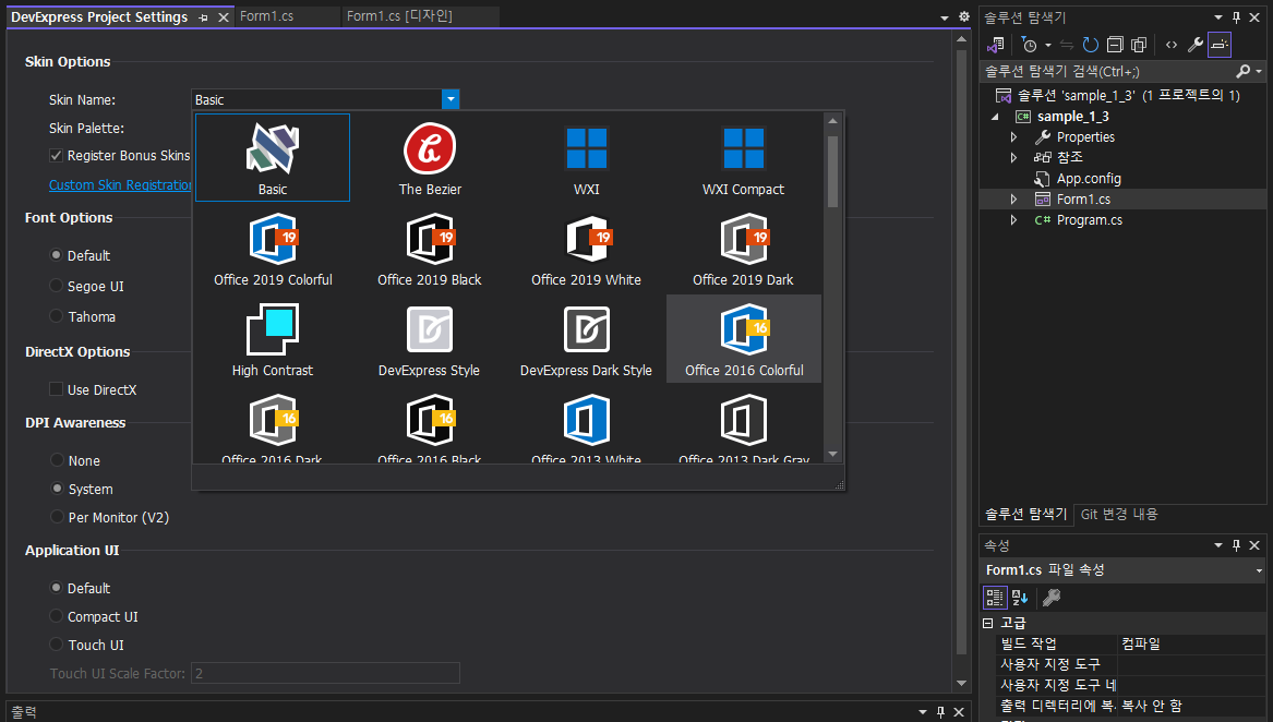 - DevExpress Project Settins 가 보이면서 화면 Skin Options -> Skin Name 을 선택하면 변경 가능합니다.