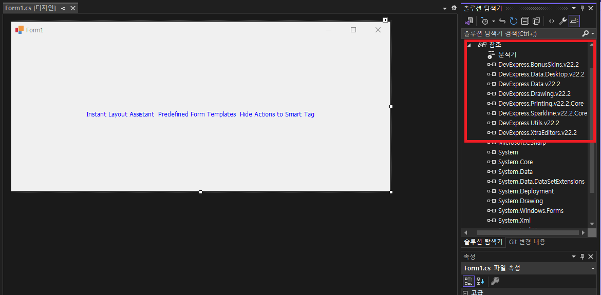 - 솔루션 탐색기에 참조를 클릭해 보시면 자동으로 필요한 DevExpress 라이브러리가 등록되어 있는것을 확인할수 있습니다.