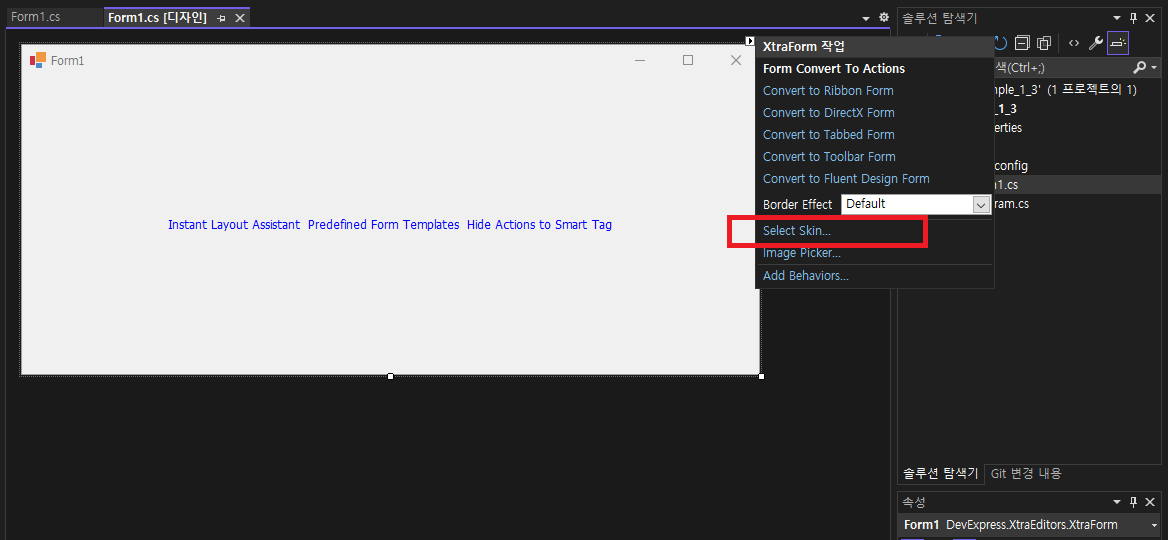 - 다시 Form1[디자인] 으로 오셔서 폼변경 오른쪽 아이콘(>) 선택하시고, Select Skin...를 선택하여주세요.