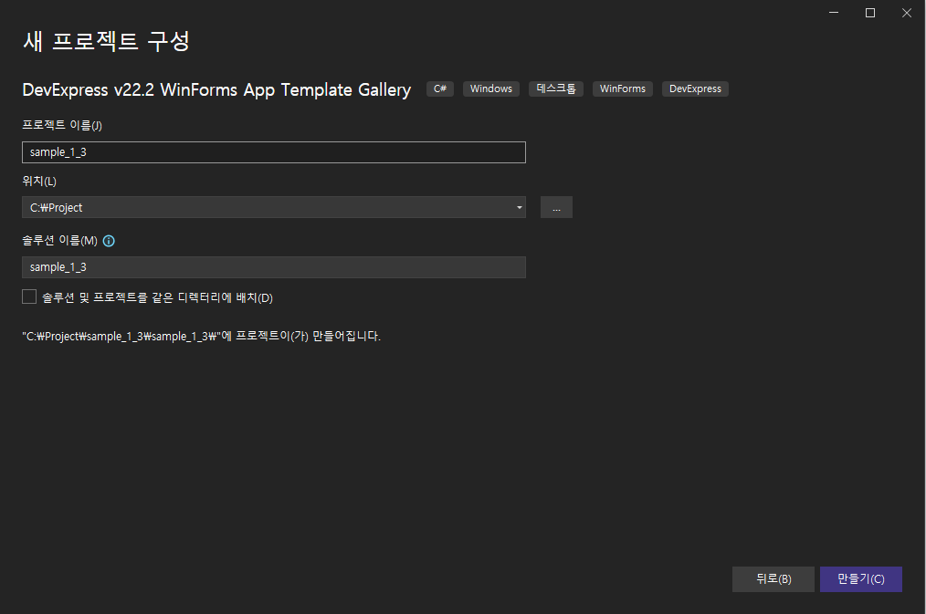 - 프로젝트 시작에서 DevExpress Winforms App Templeate Gallery를 선택 -> 다음