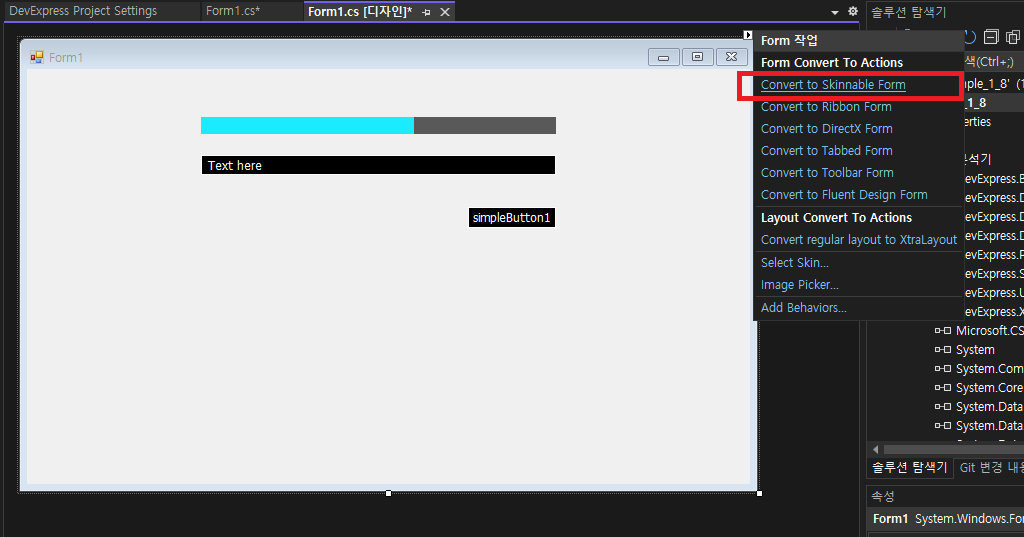 - 소스 상속을 DevExpress로 변경하기 위해서는 Form작업에서 Convert to Skinnable Form를 선택합니다.