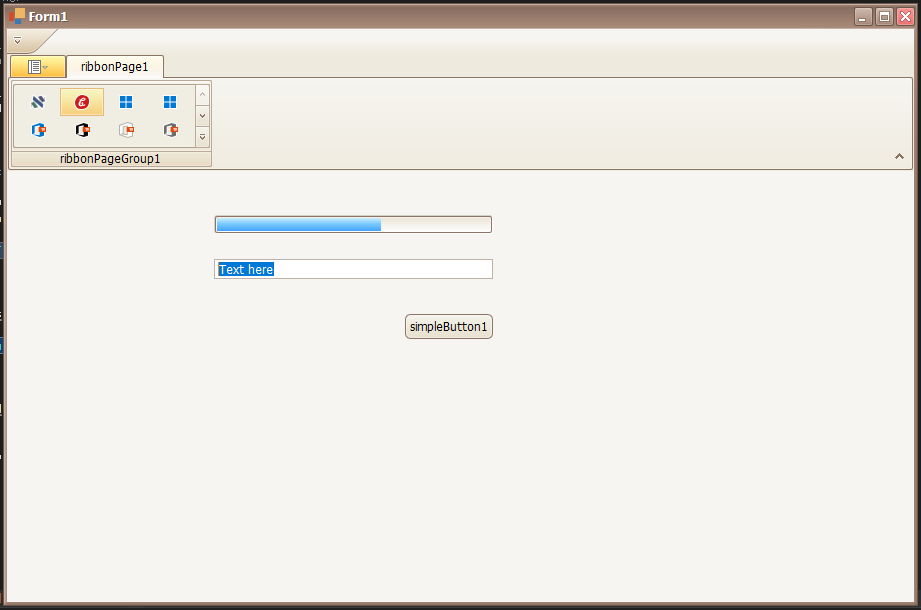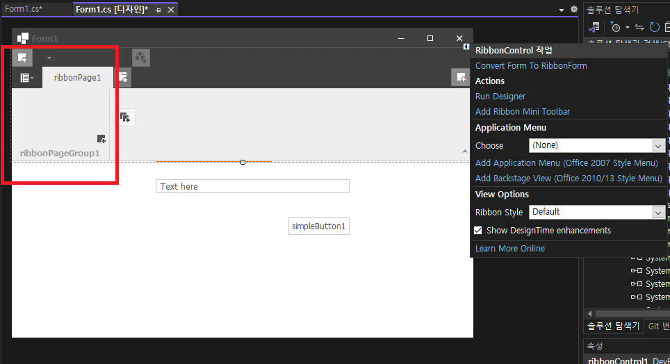 - Toolbox -> RibbonControl 선택후 Form에 추가(화면클릭)