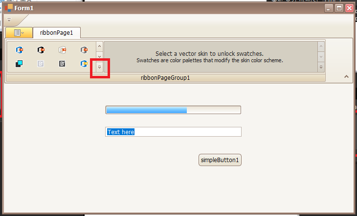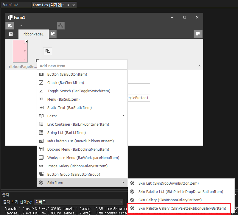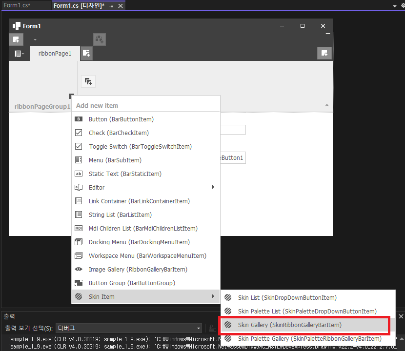 - ribbonPageGroup1 클릭후 Skin Item -> Skin Gallery 선택