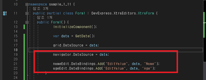 - TextEdit Name(ageEdit)에서 데이터 -> DataBindings -> EditValue  변경 -> bindingSource1 -> Age 선택