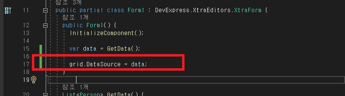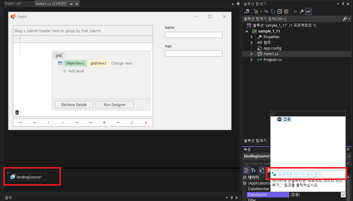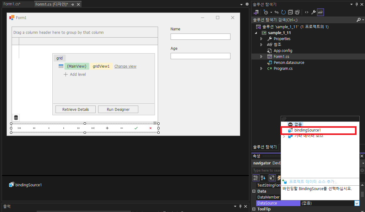 - Data GridControl(grid)에서 DataSource 변경 -> bindingSource1 선택