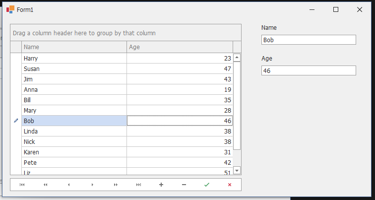 - 마우스 클릭이나 DataNavigator를 사용시 오른쪽 Name, Age에 같이 표시해 보겠습니다.