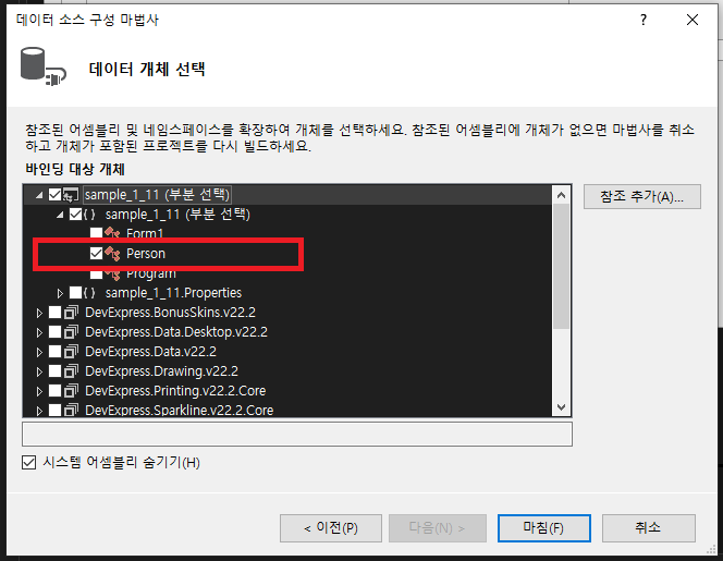 - 데이터 개체 선택 -> sample_1_11 -> Person 선택 -> 마침