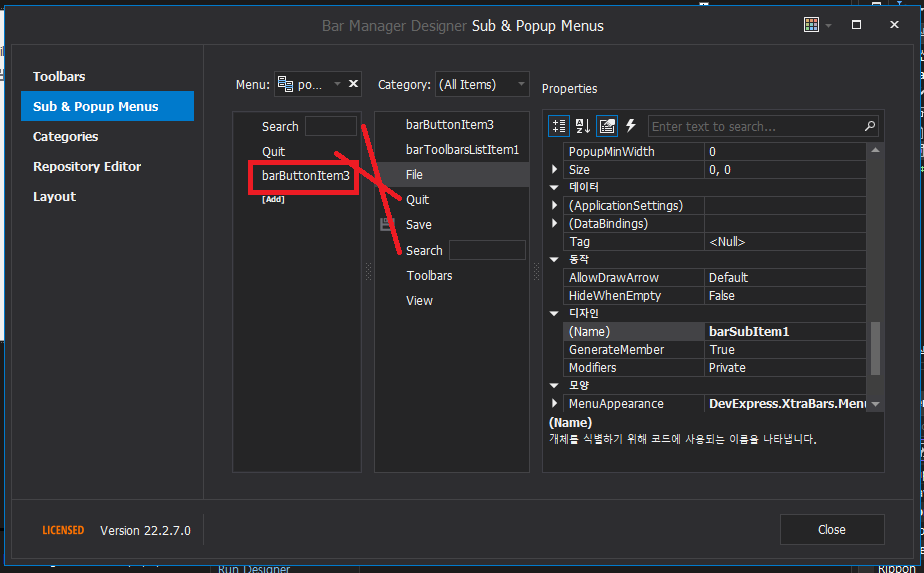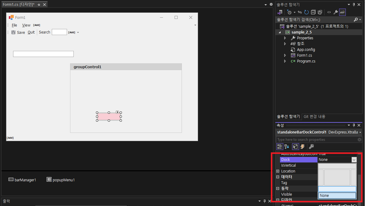 - standaloneBarDockControl1를 Dock 선택후 Bottom 선택