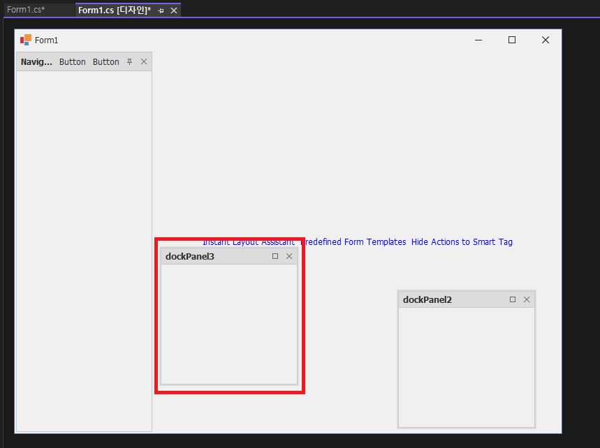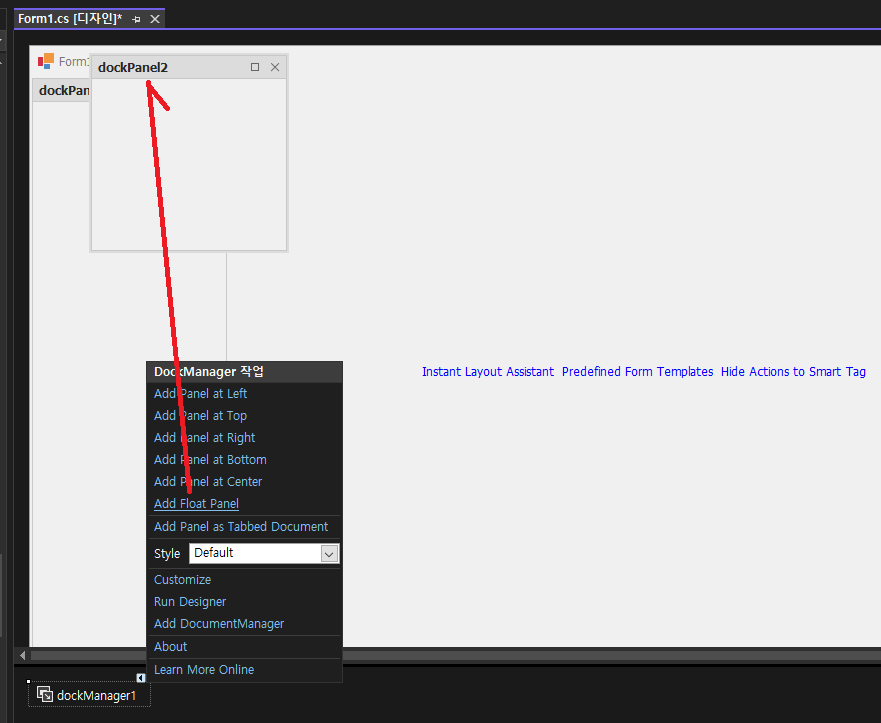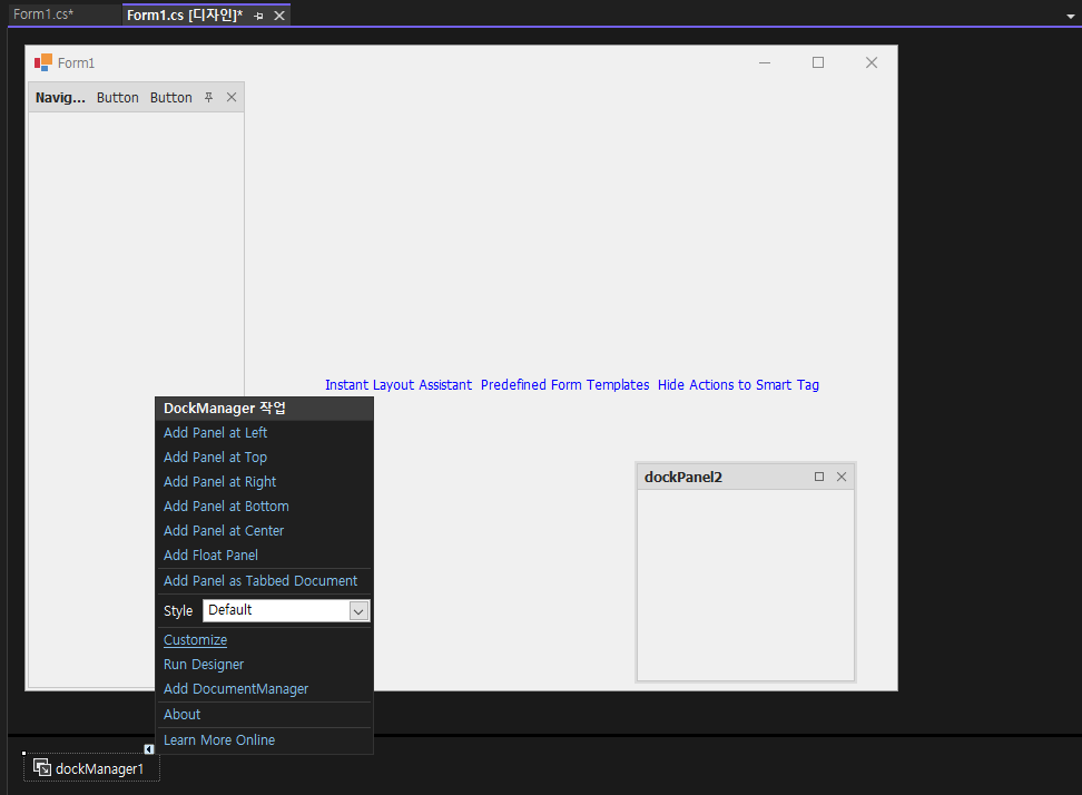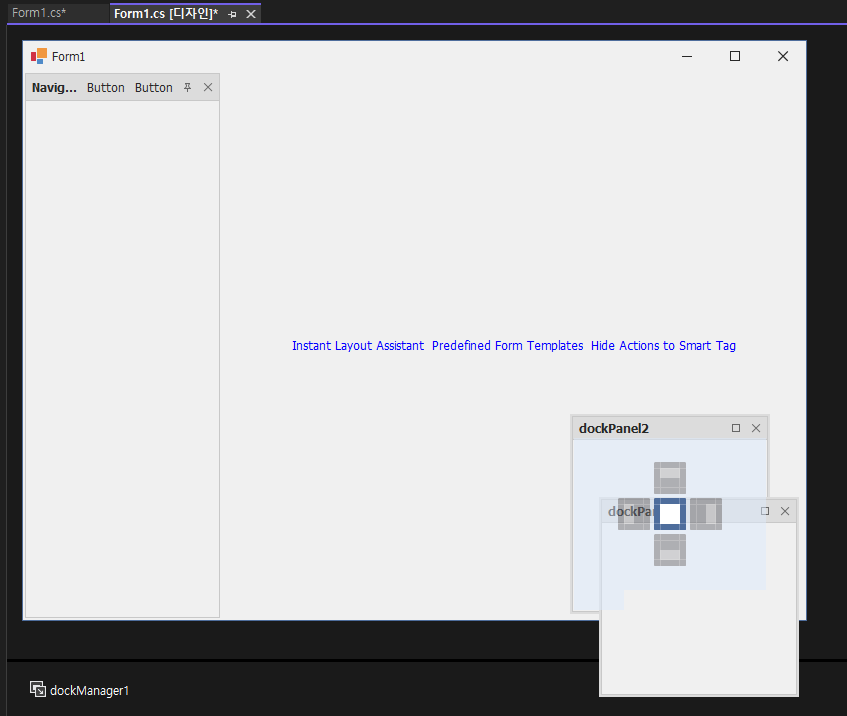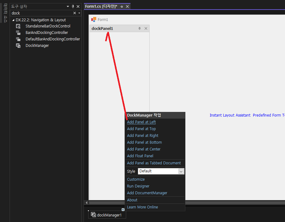 - DockManager를 검색해서 Form1 디자인에 추가 합니다.