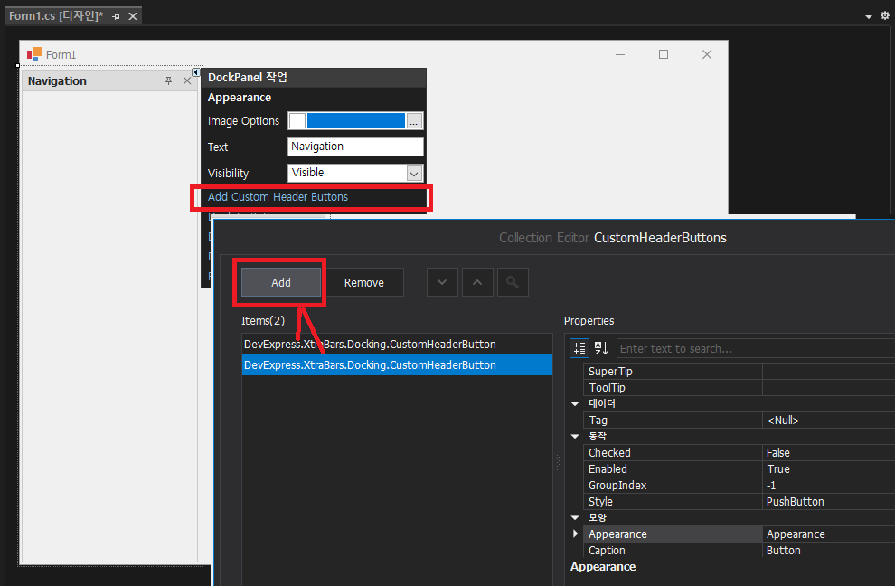 - dockPanel1선택후 CustomButtonClick 더블클릭후 소스를 추가합니다.