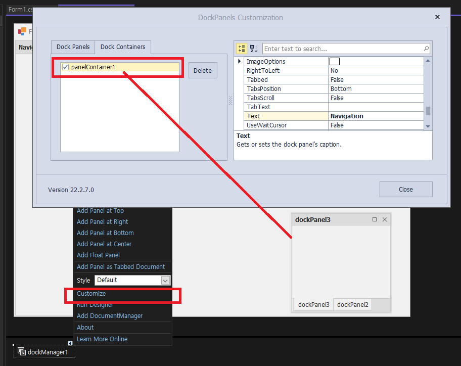 - 아래 dockManager1에서 DockManager 작업 선택 -> Customize 선택