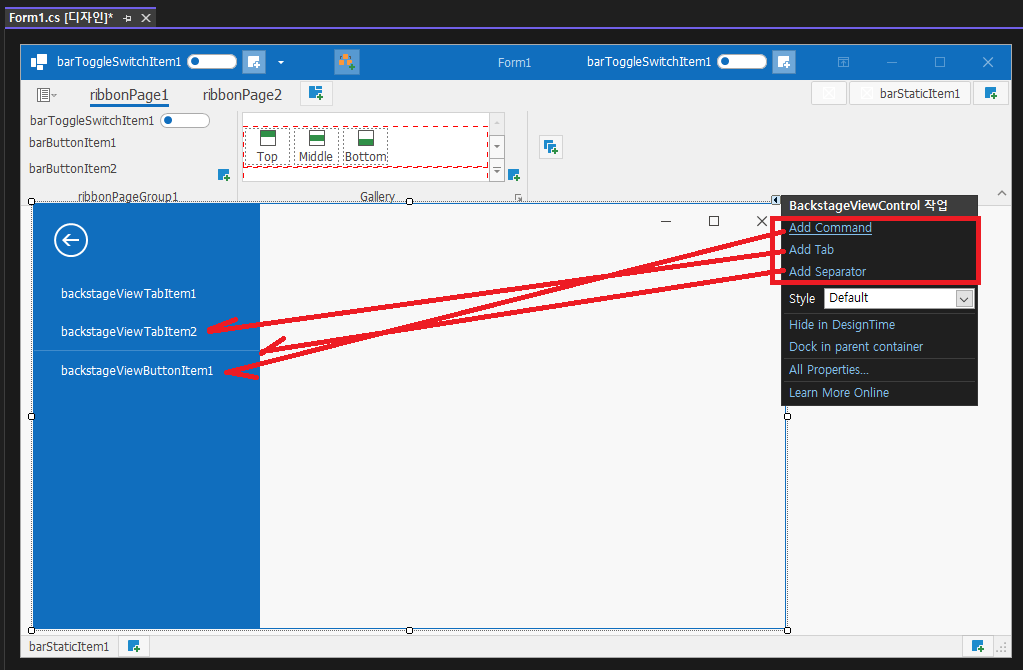 - BackstageViewControl 작업을 선택하고, 순서대로 Add Tab, Add Separator, Add Command 를 추가합니다.