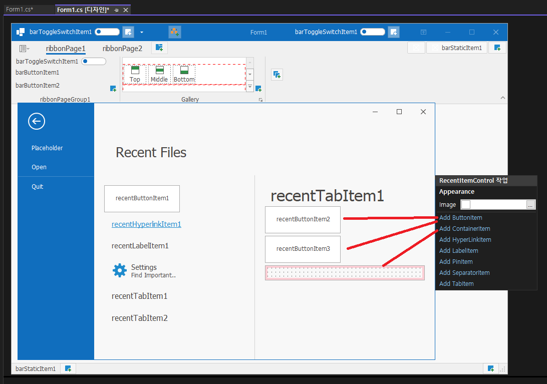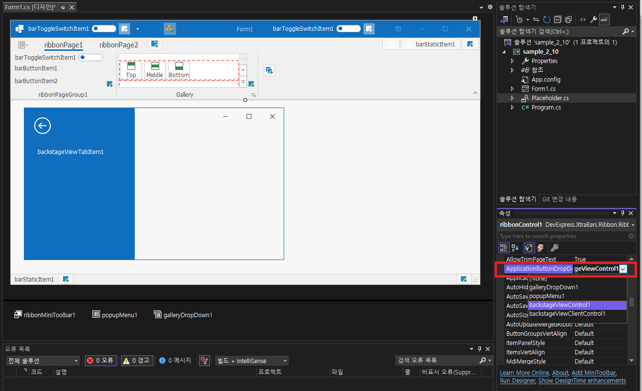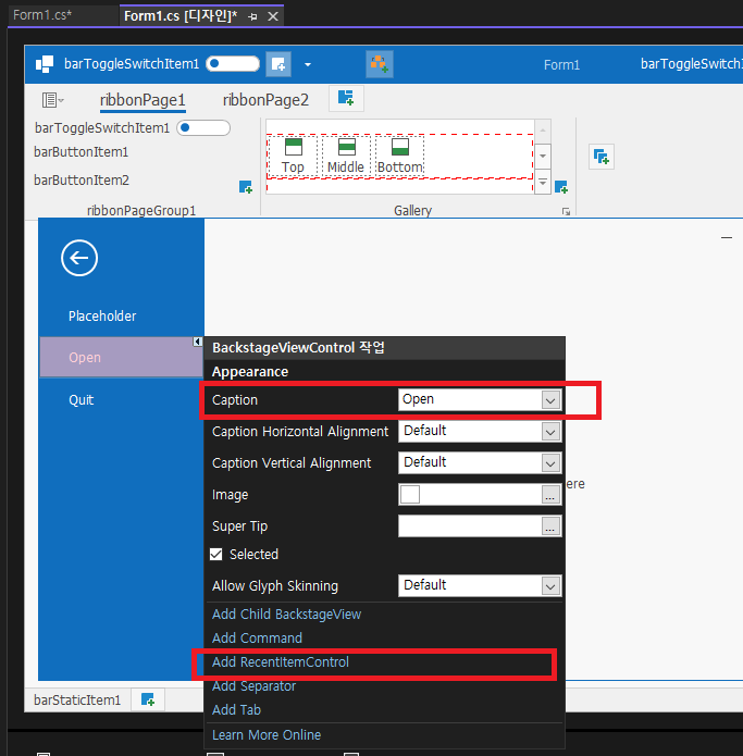 - Ribbon Control (ribbonControl1) -> ApplicationButtonDropDownControl : backstageViewControl1 자동 선택되어 있습니다.