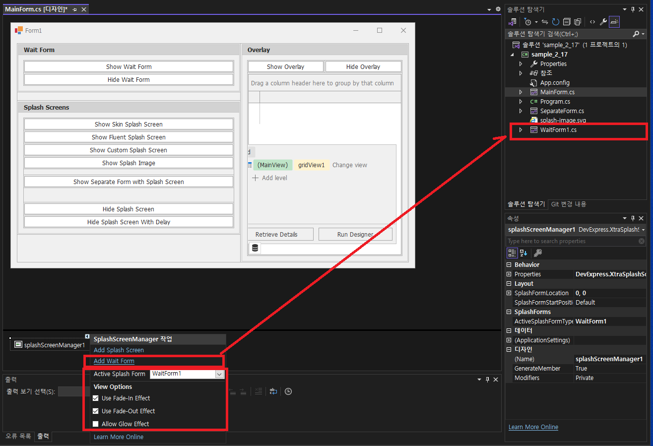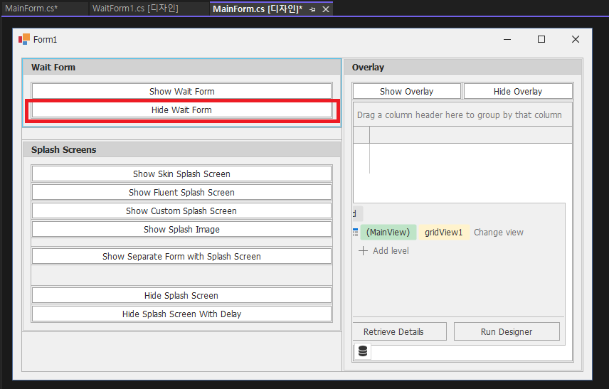 - SplashScreenManager 컴포넌트 추가후 기본으로 제공되는 Wait Form에 대해 진행하겠습니다.