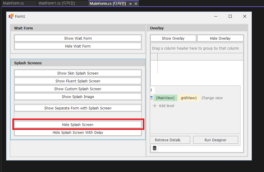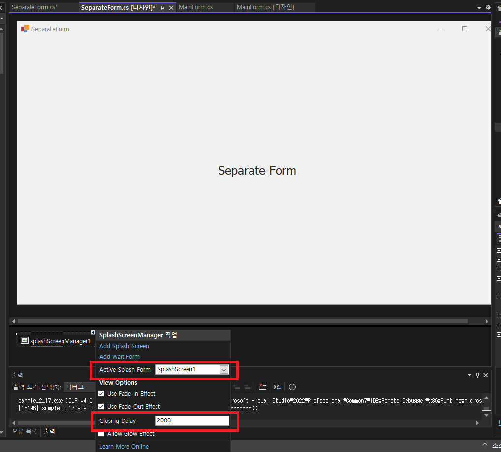 - SeparateForm에서 splashScreenManager1 선택후 SplashScreenManager 작업