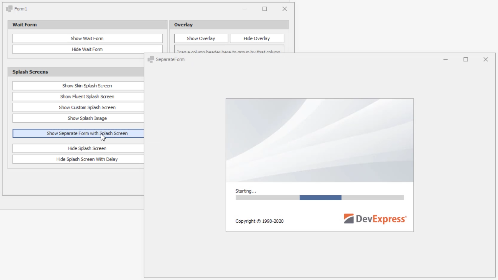SplashScreenManager.ShowForm(this, typeof(SplashScreen1), true, true, SplashFormStartPosition.CenterScreen);