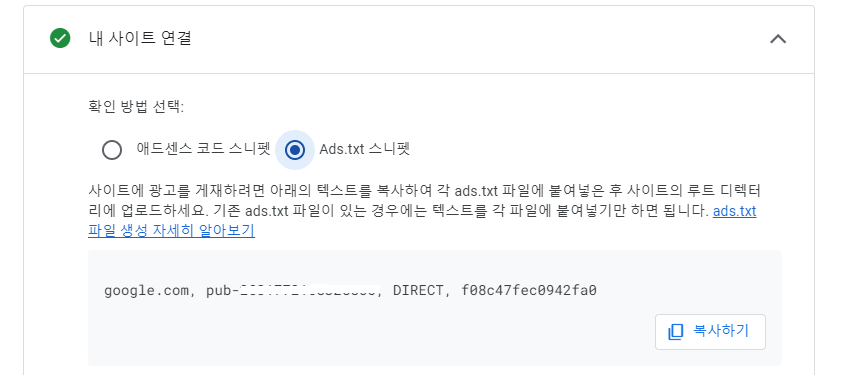 -> 내사이트연결에서 Ads.txt 스니펫를 선택하시면 자신에 pub-xxxxxx 가 표시된것을 확인할수 있습니다.