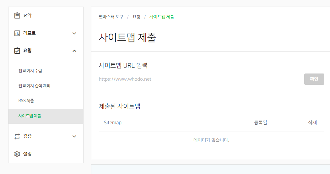 사이트맵 URL 입력에 자신의 URL과 'sitemap.xml'를 입력하고 '확인' 버튼
