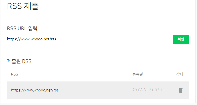 사이트맵 URL 입력에 자신의 URL과 'rss'를 입력하고 '확인' 버튼