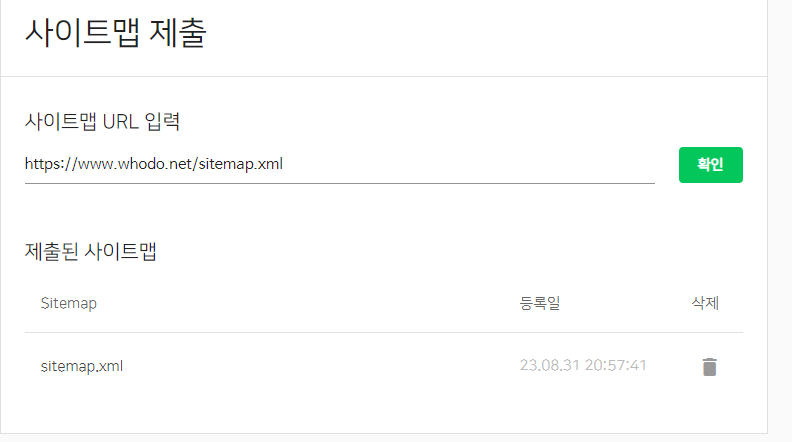 사이트맵 URL 입력에 자신의 URL과 'sitemap.xml'를 입력하고 '확인' 버튼