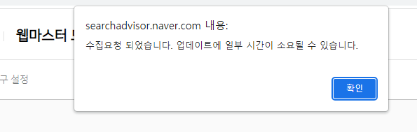 - '수집요청' 클릭을 합니다. (수집요청 되었습니다. 엡데이트에 일부 시간이 소요될 수 있습니다.) '확인' 클릭