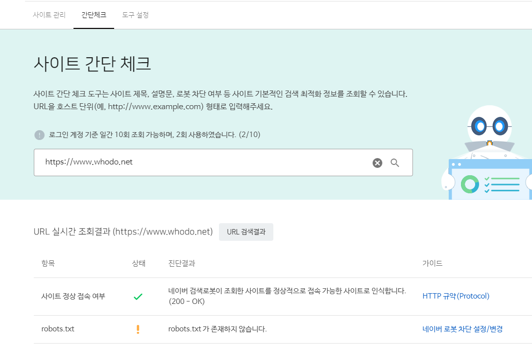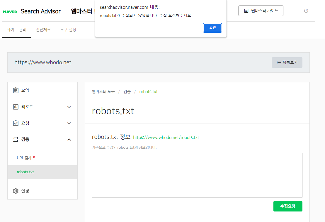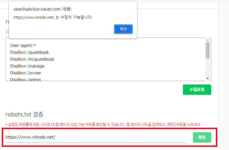 - 'robots.txt가 수입되지 않습니다. 수집 요청해 주세요'라는 메세지가 뜨면 '확인' 버튼