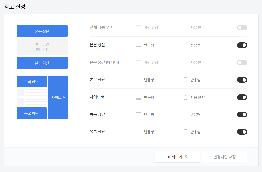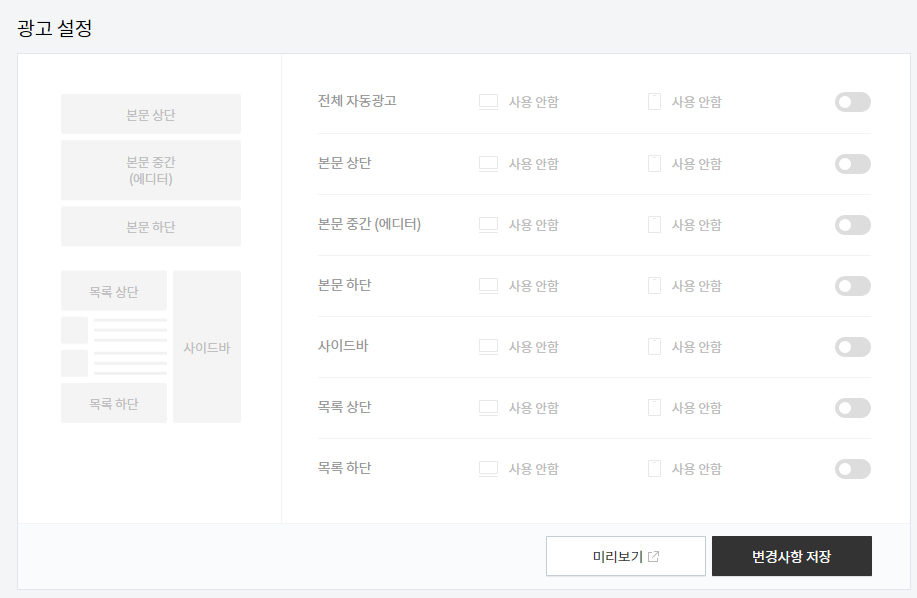 - 기존에 애드센스도 광고설정에서 모두 제거하고 (사용안함)저장합니다.