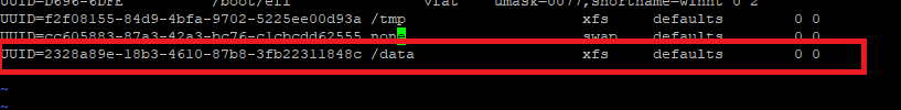 # vi /etc/fstab                                     (HDD 연결정보 등록)