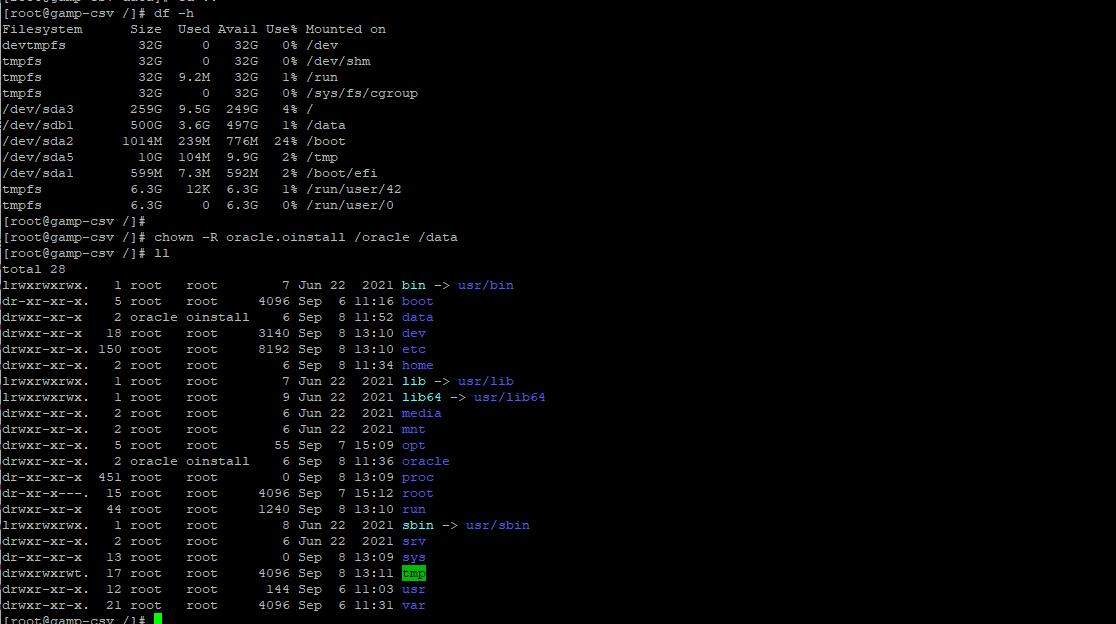 # chown -R oracle.ointall /oracle /data (오라클 설치를 위한 권한 부여 - 오라클설치에서 자세히 설명)