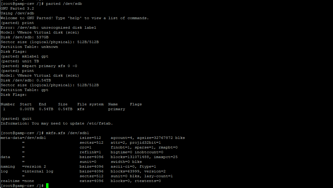 # mkpart primary xfs 0 -0                     (파티션 영역 설정 전체(-0) 또는 하드용량 0.5TB)