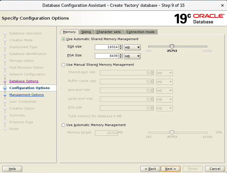 - Memory는 오라클이 사용할 영역입니다. (RAM 총64GB 이면 오라클이 25GB를 사용한다는 표시입니다.)