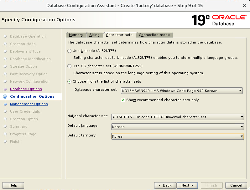 - DB 자료중 한글사용 선택입니다. 윈도를 대부분 사용하여 아래를 권장합니다. (AL16UTF16)
