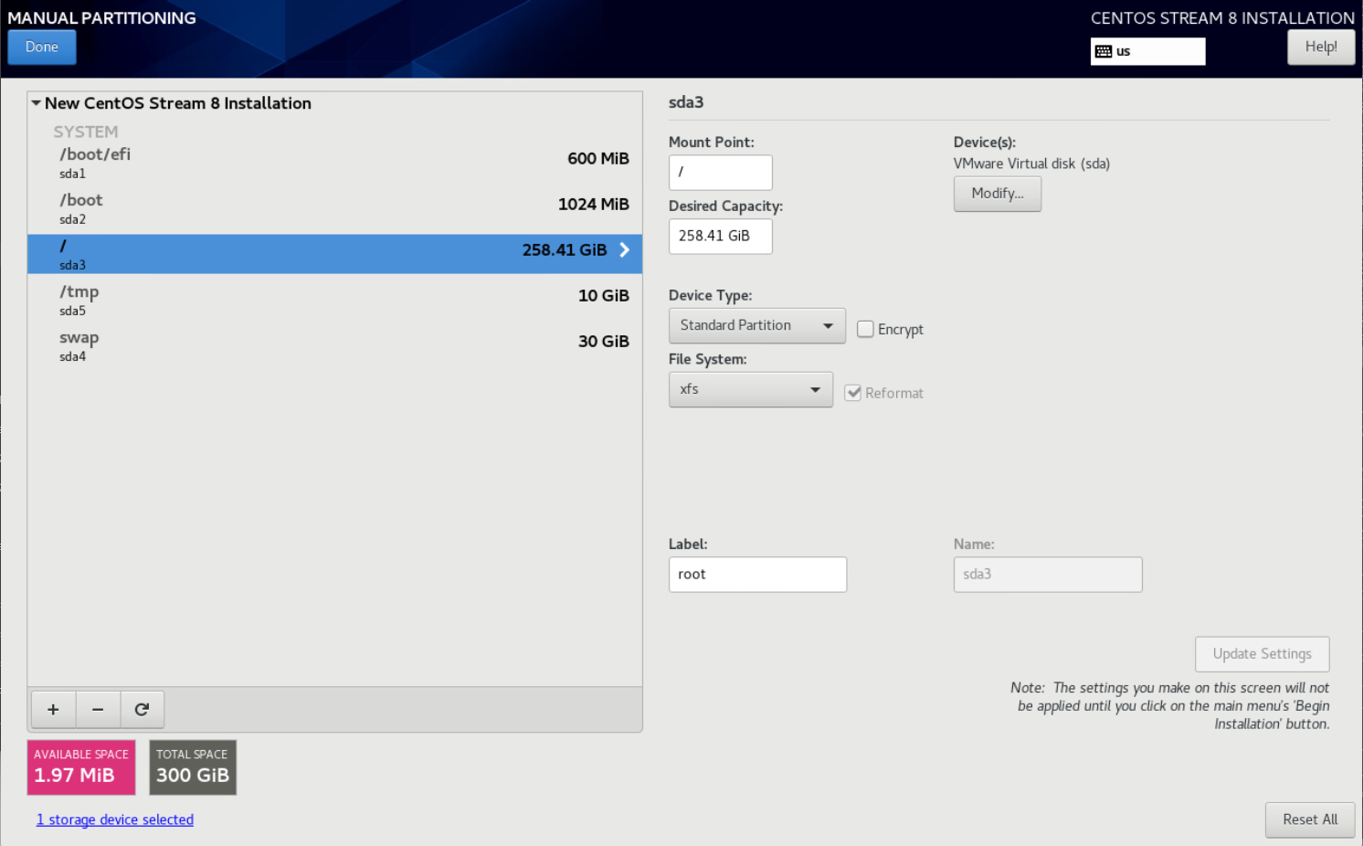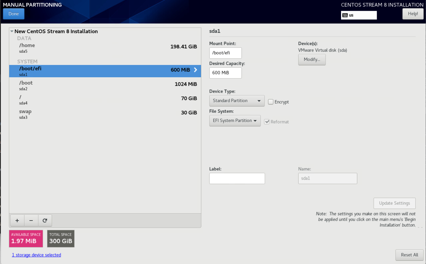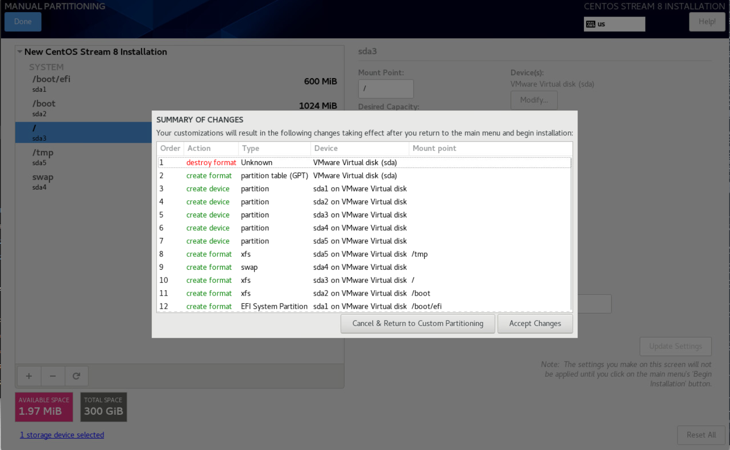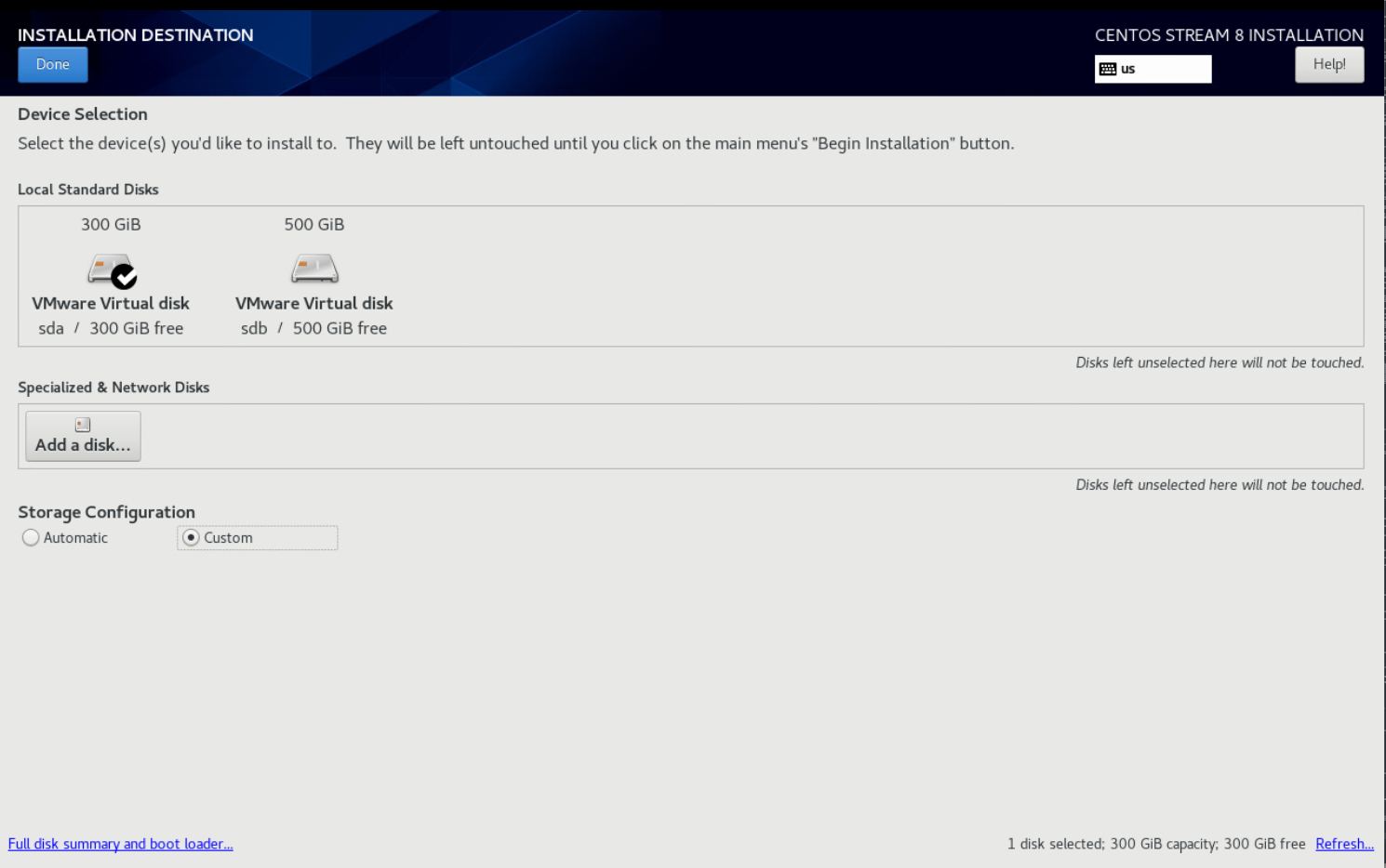 - 300GB 를 OS로 사용할 예정이고 파티션은 자동(Automatic)이 아닌 수동(Custom)를 선택합니다.