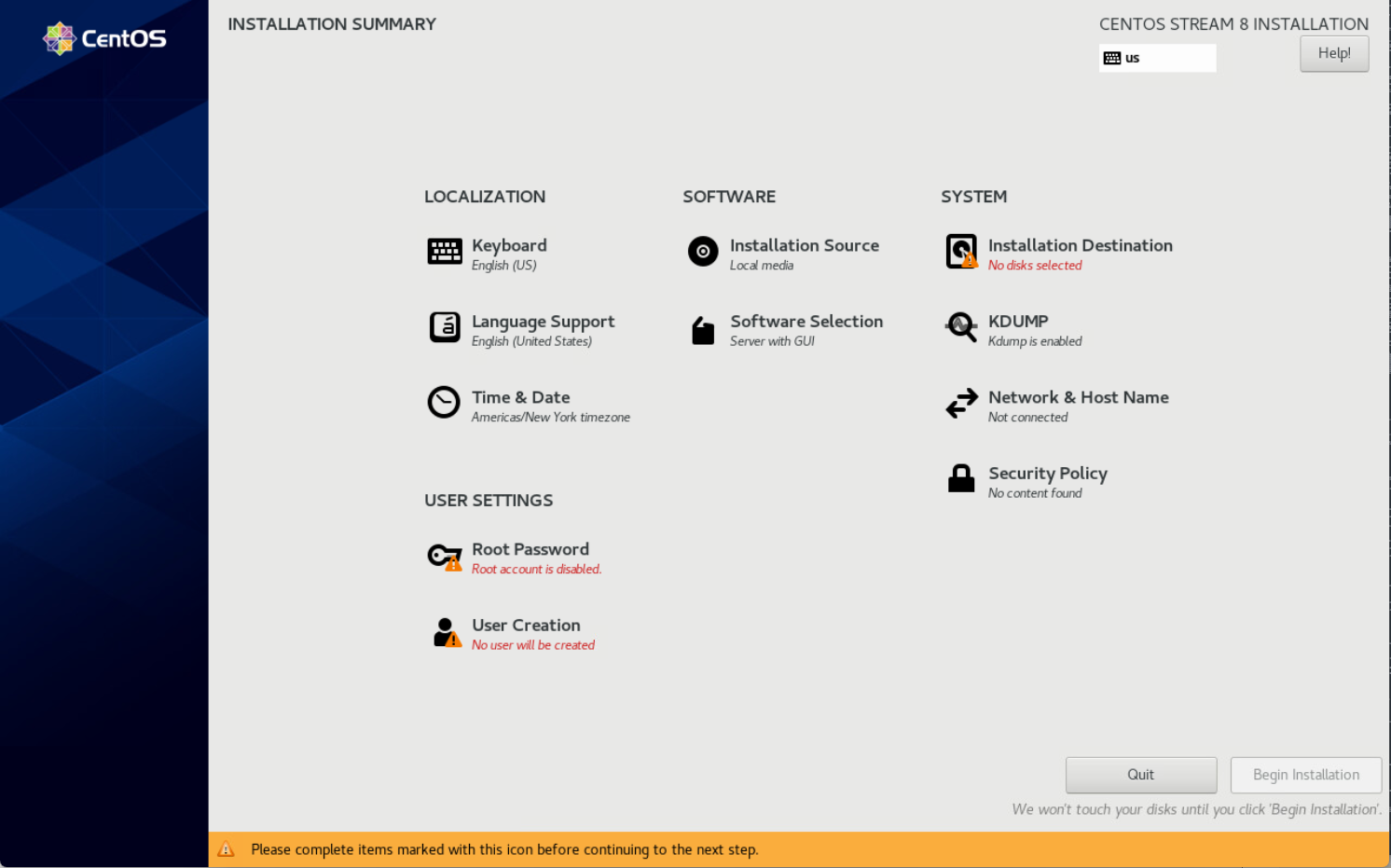 'Begin Installation'를 눌러 설치를 시작합니다.