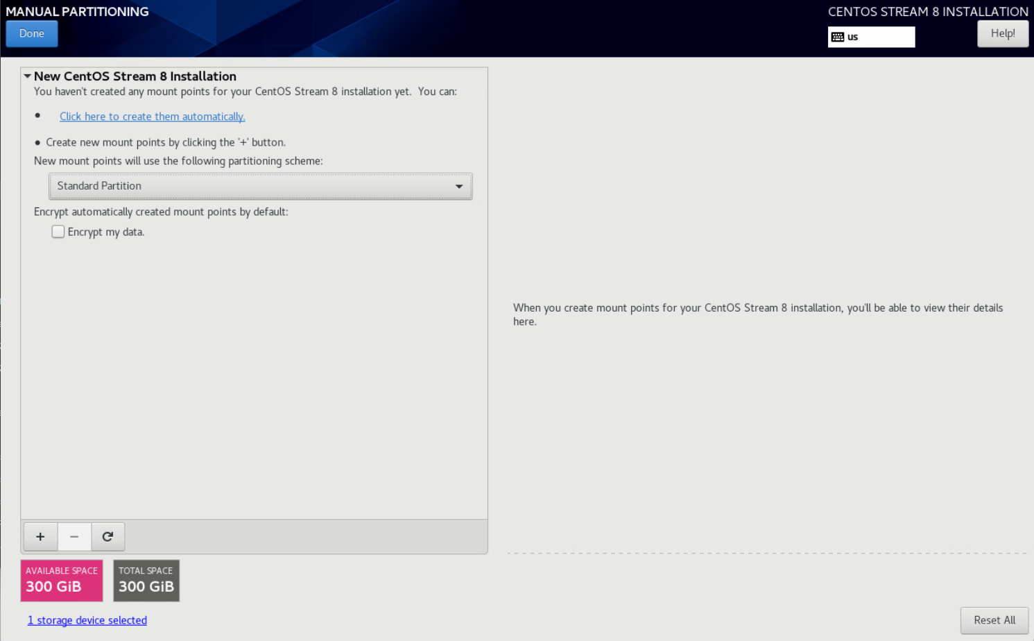'Standard Partistion' 선택 -> 'Click here to create them automatically' 선택하면 기본 파티선을 생성하여 줍니다.