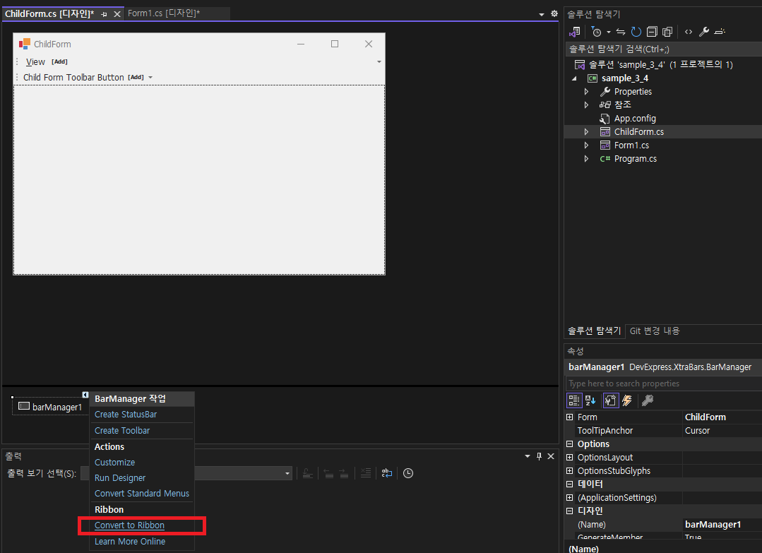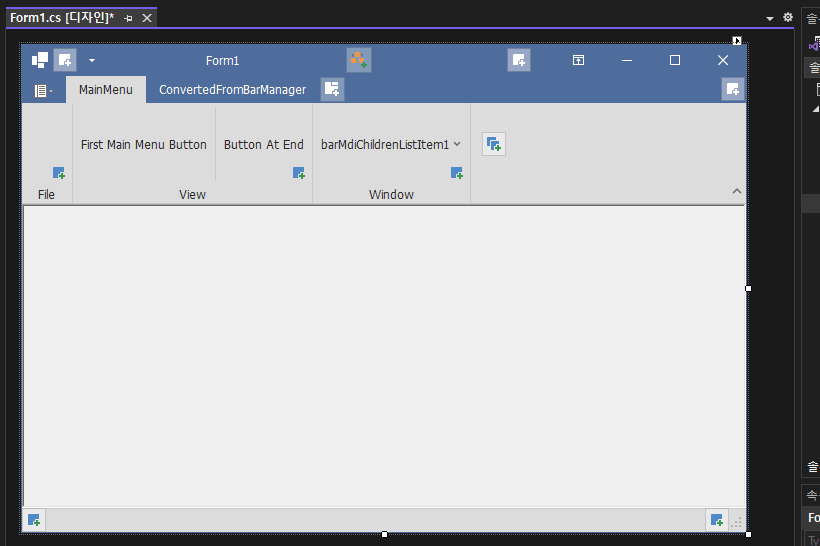 - barManager1 -> BarManager 작업 -> Conver to Ribbon 선택