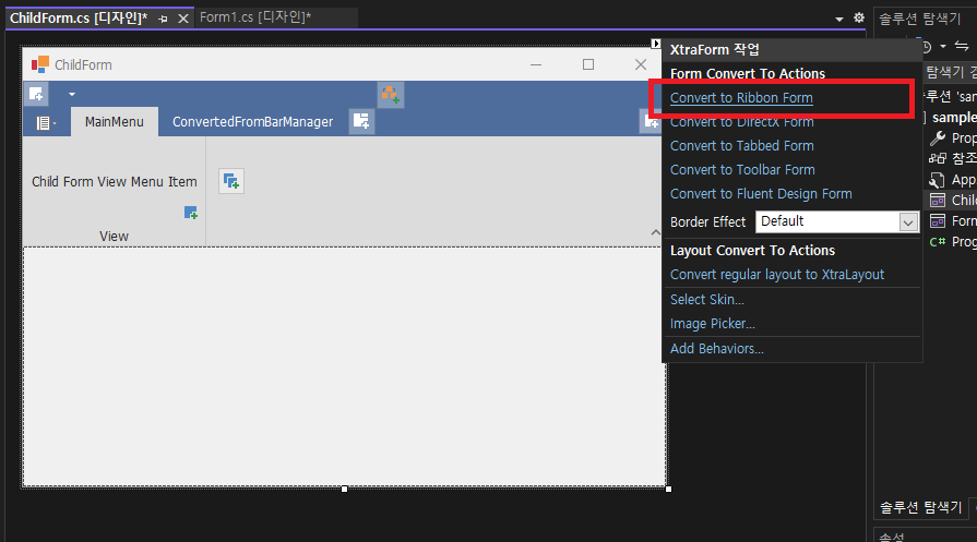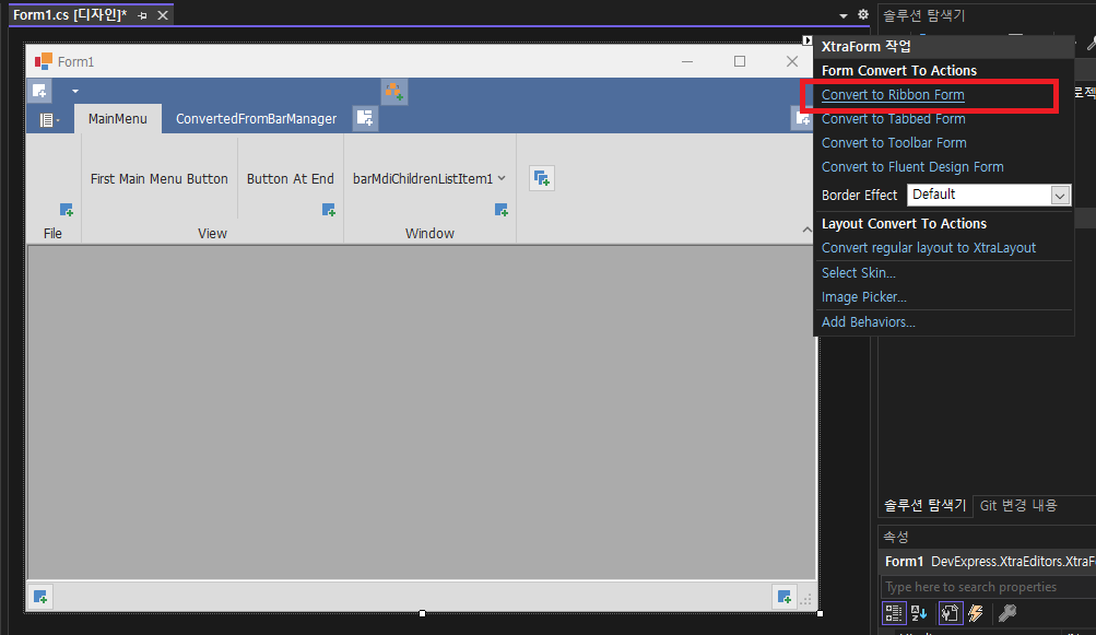 - 기본 Form -> XtraForm 작업 -> Convert to Ribbon Form 선택