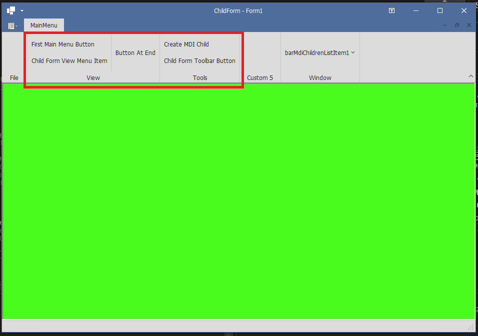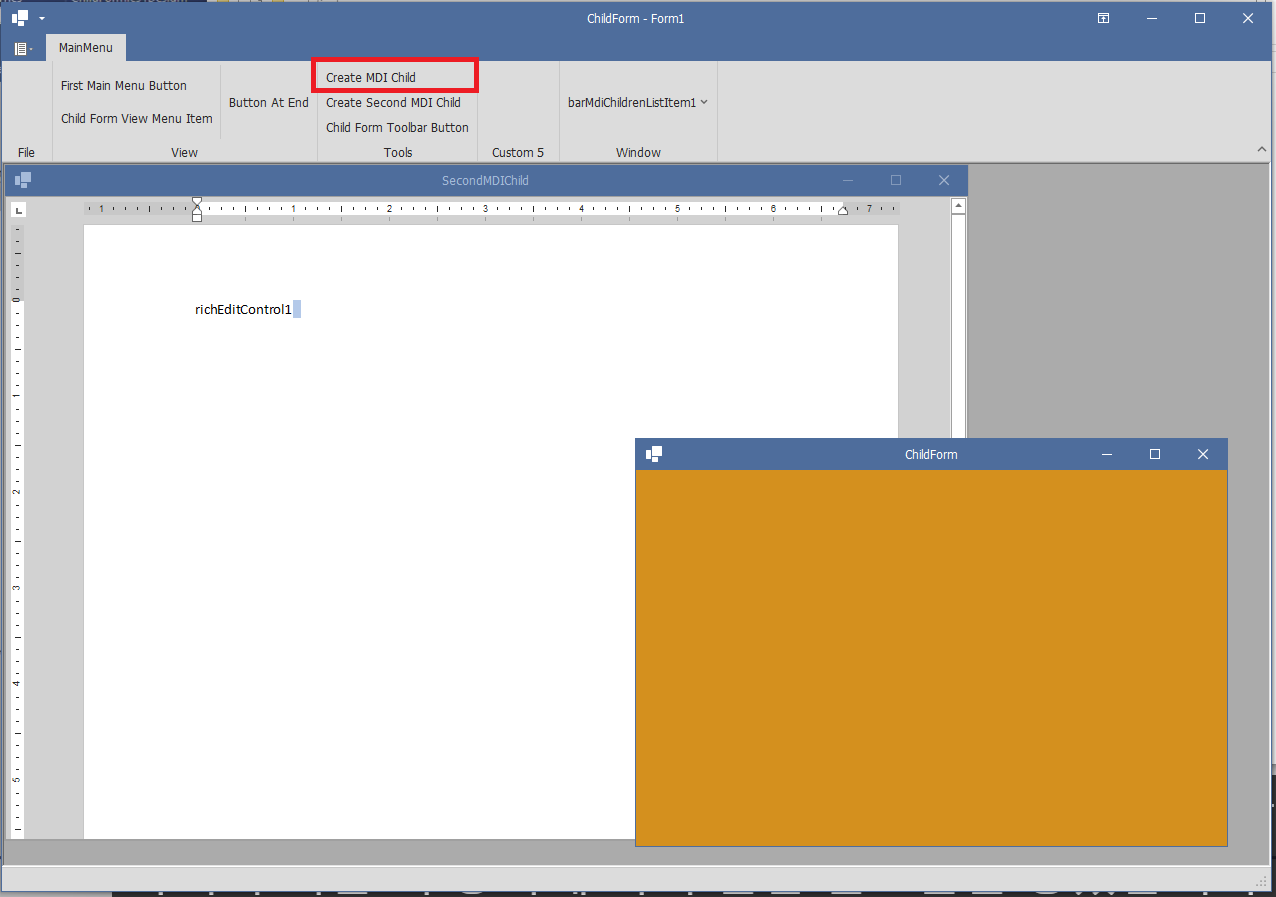 - 실행후 자식 MDI 버튼 ('Create MDI Child') 호출시 Ribbon 병합동작이 BarManager의 동작과 다르게 나타납니다.