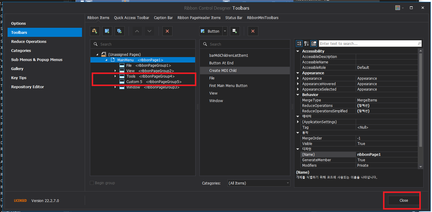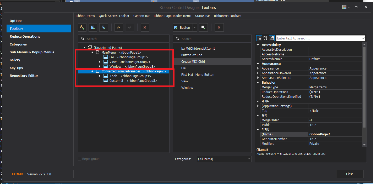 - Toobars -> Ribbon Items -> 첫번째 ribbon 페이지에 여러 페이지 그룹이 있고 두번째 ribbon 페이지에는 이전에 도구모은에 있었던 항목에 대한 자체 페이지 그룹이 2개 있습니다.