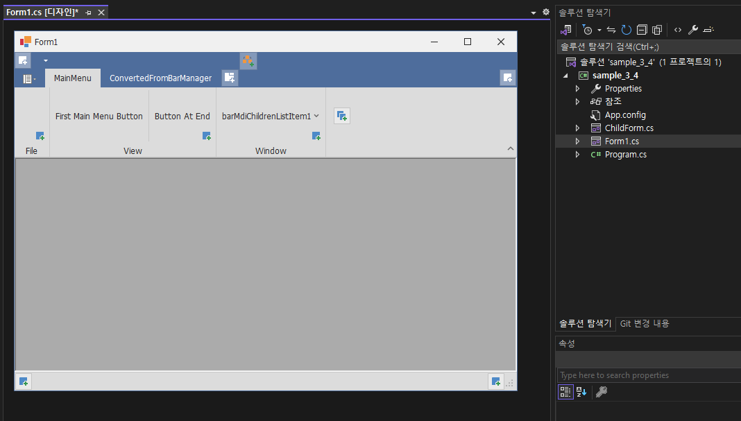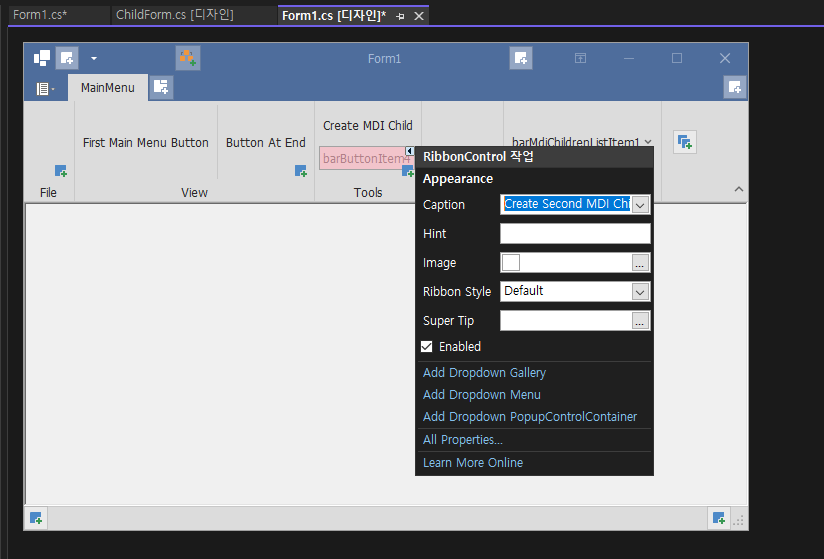 - 자식 Form이 변경될때 부모 Ribbon 메뉴가 변경되는것을 확인하기 위해 만들어져 있는 폼을 추가 해 보겠습니다.