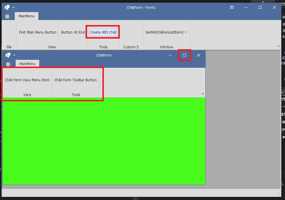 - 실행후 자식 MDI 버튼 ('Create MDI Child') 호출시 Ribbon 병합동작이 BarManager의 동작과 다르게 나타납니다.