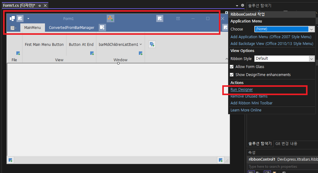 - 기본 Form 상단 선택 -> RibbonControl 작업 -> Run Designer 선택