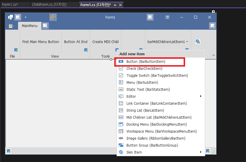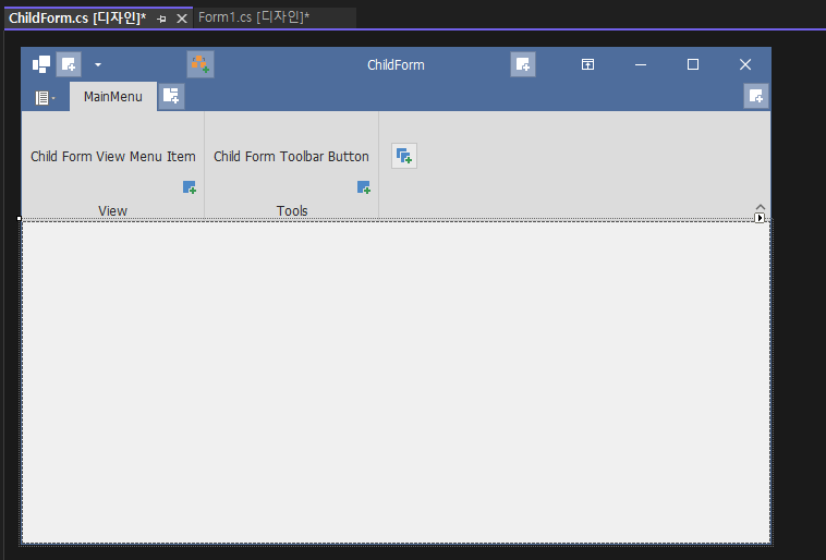 - 자식 Form이 변경될때 부모 Ribbon 메뉴가 변경되는것을 확인하기 위해 만들어져 있는 폼을 추가 해 보겠습니다.