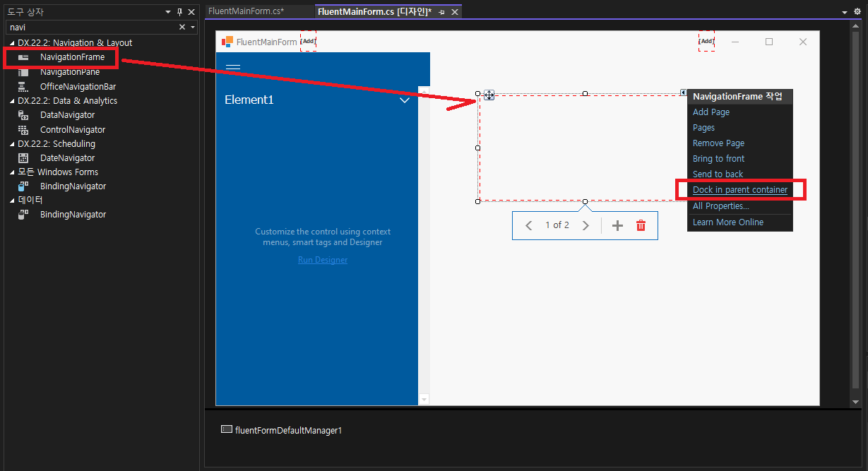 - SDI 애플리케이션의 도구상자에서 NavigationFrame 을 추가하고 사용가능한 공간을 채우기 위해 Docking 합니다.