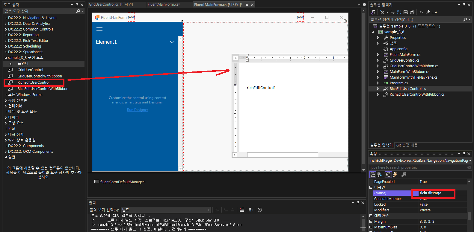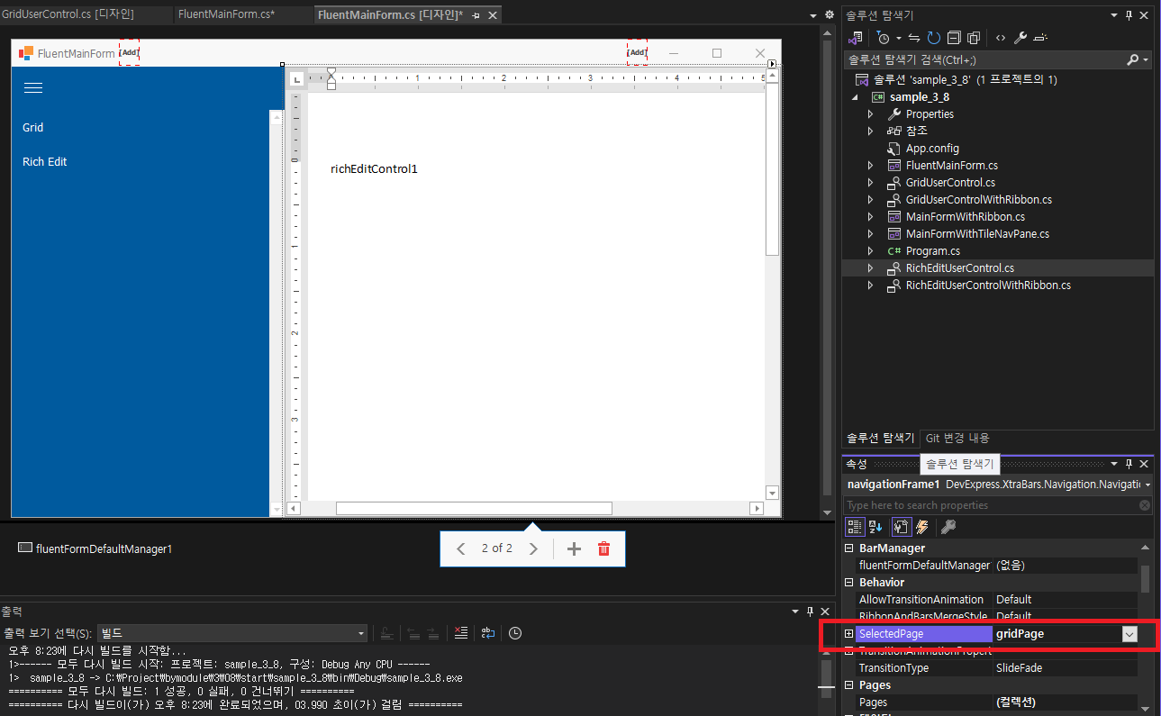 - 두번째 페이지는 이름을 richEditPage로 변경하고 리치편집 사용자 컨트롤을 추가하고, Dock (None -> Fill) 변경합니다.