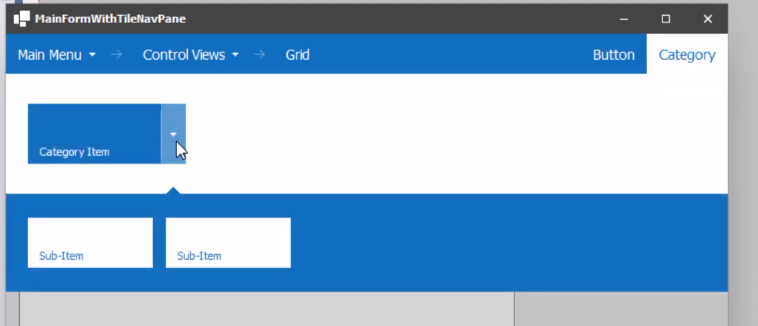 - 기본 메뉴을 열고 선택하면, 연속 탐색을 사용하도록 타일 탐색 창을 구성한 이후의 카테고리 타일 간단한 최상위 속성 설정, 선택한 카테고리가 증시 확장되고 항목이 강장 오른쪽 버튼에 표시됩.