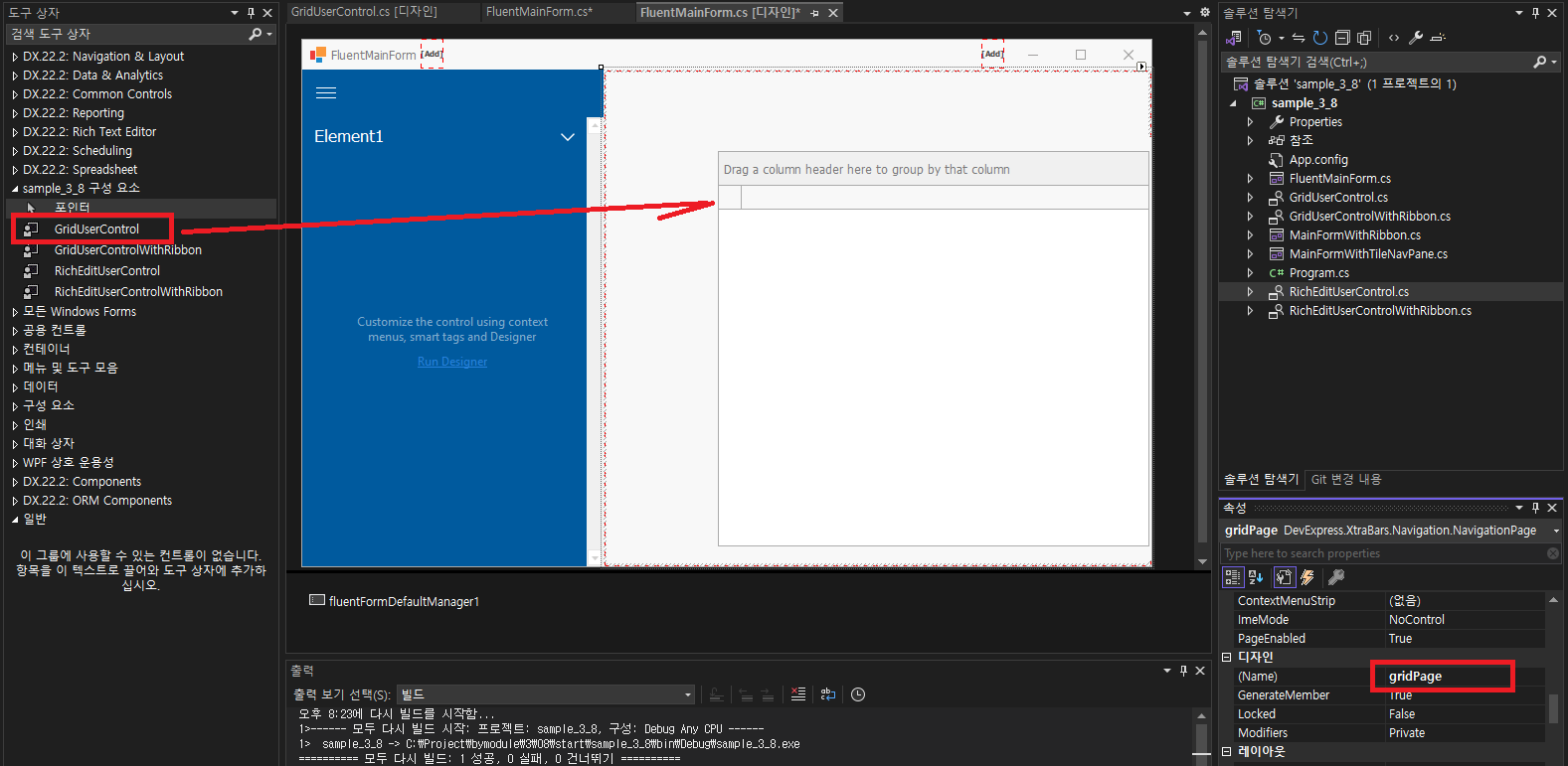 - 첫 번째 페이지의 이름을 gridPage로 변경하고 도구상자에서 그리드 사용자 컨트롤을 추가하여, Dock (None -> Fill) 변경합니다. ( 사용자 컨트롤이 표시가 않되는 경우 솔루션 다시빌드를 하시면 표시가 됩니다. - 실행했다 종료해도 됨)